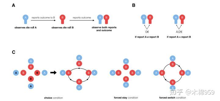 两名参与者要搭档完成任务,A会在电脑上看到一个骰子点数,然后告诉B,随后B也会在自己电脑上看到另一个骰子点数并报告出来。如果两个人报告的点数相同,就能获得相应点数的金钱奖励;如果不同,就没有奖励。